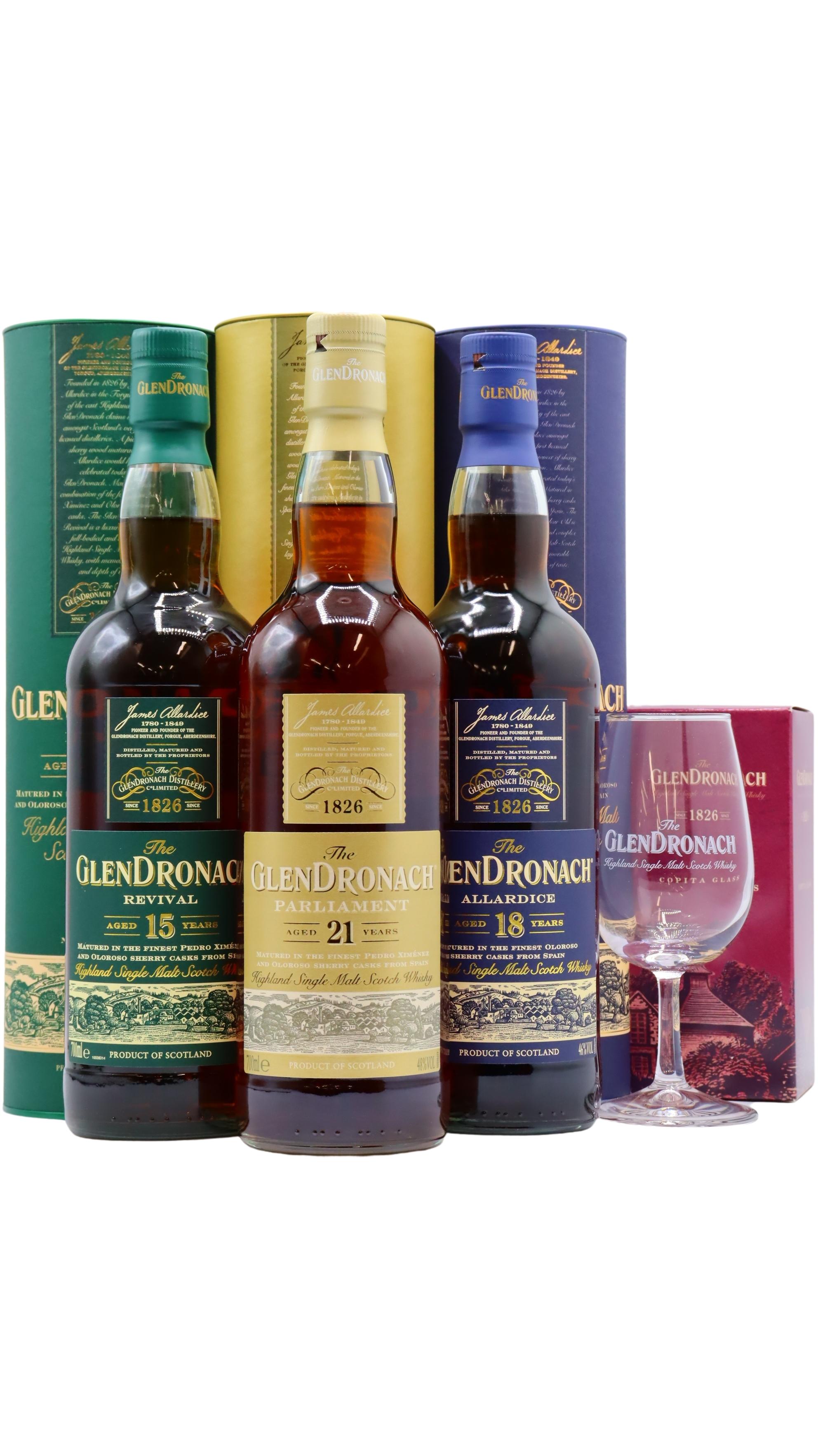 Glendronach - 15- 18 & 21 Year Old Single Malt Scotch Whisky (3 x 70cl) (Includes Branded Glass)