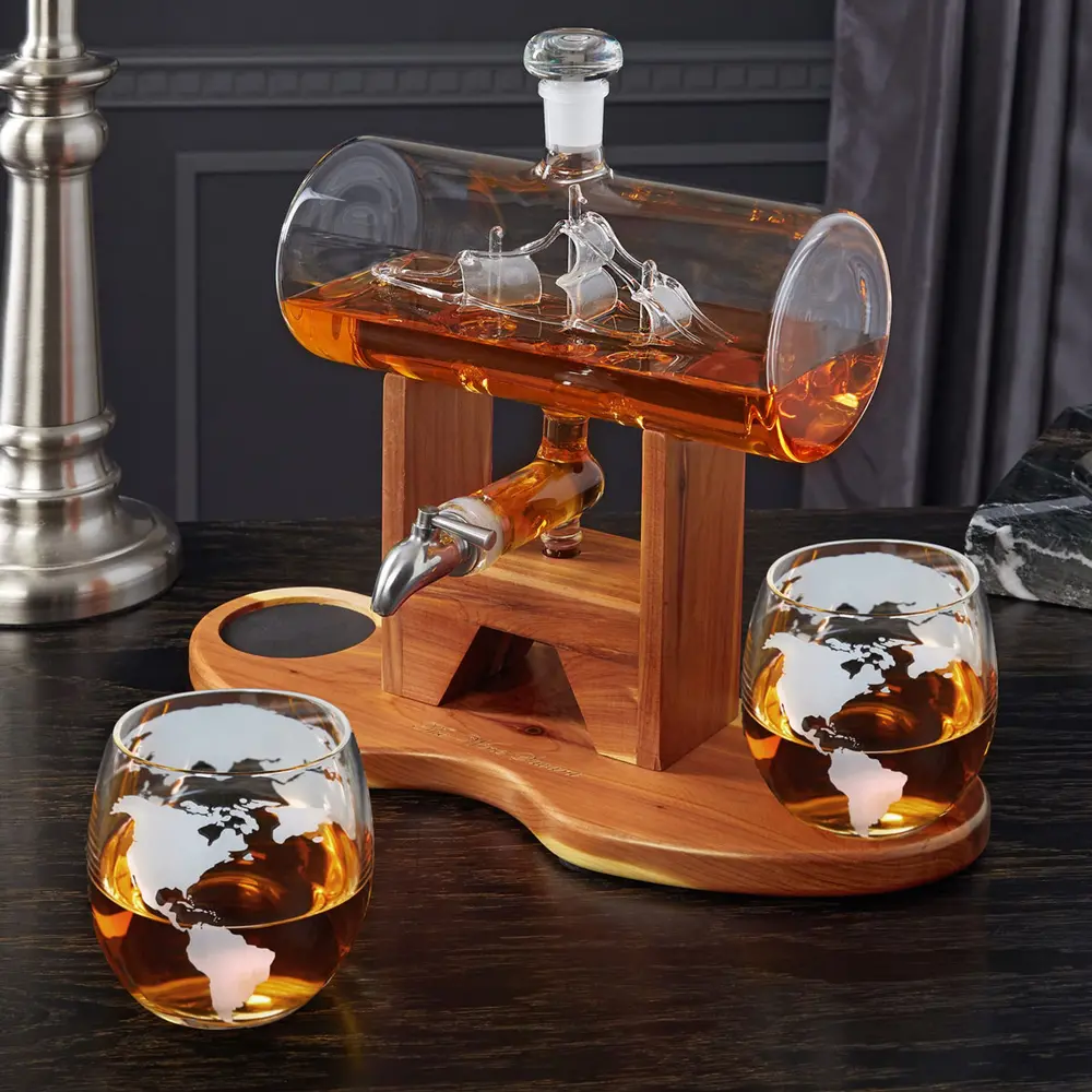 - The ship in a bottle decanter set includes one ship decanter, two glasses, and a wooden stand